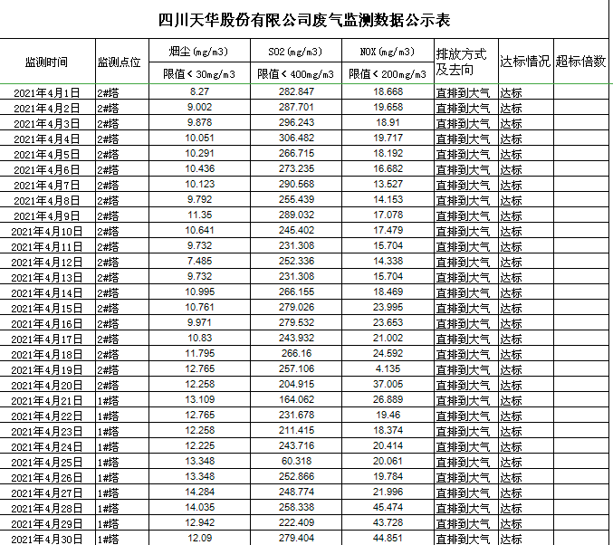 四川天華股份有限公司4月廢氣監測數據公示