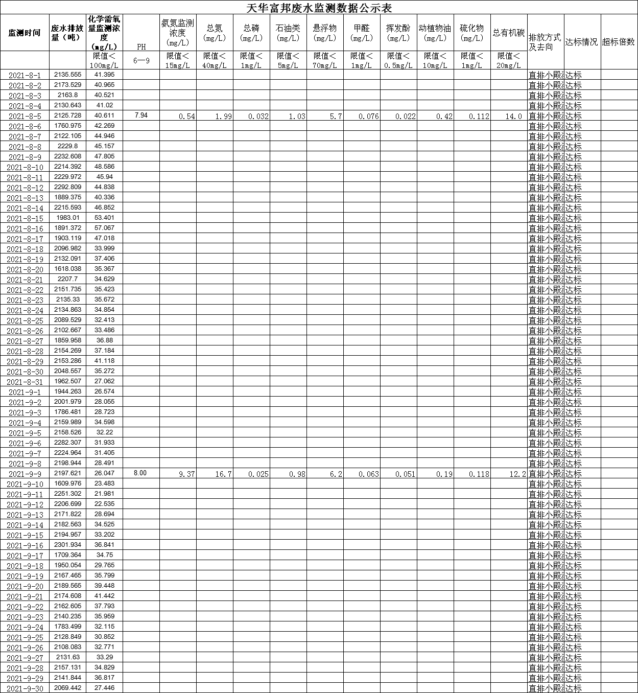 四川天華富邦化工有限責(zé)任公司8月、9月廢水監(jiān)測數(shù)據(jù)公示