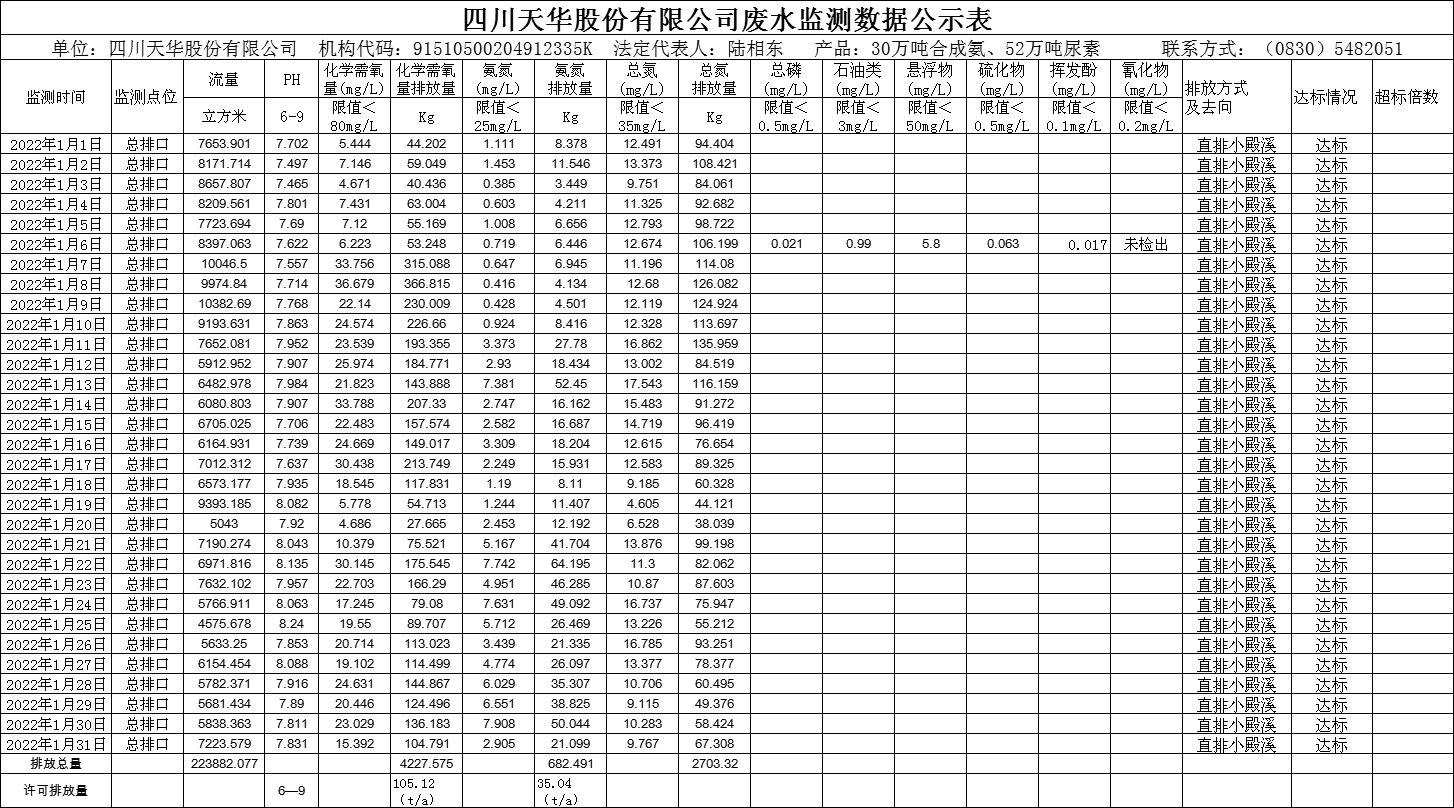四川天華股份有限公司2022年1月廢水監(jiān)測(cè)數(shù)據(jù)公示